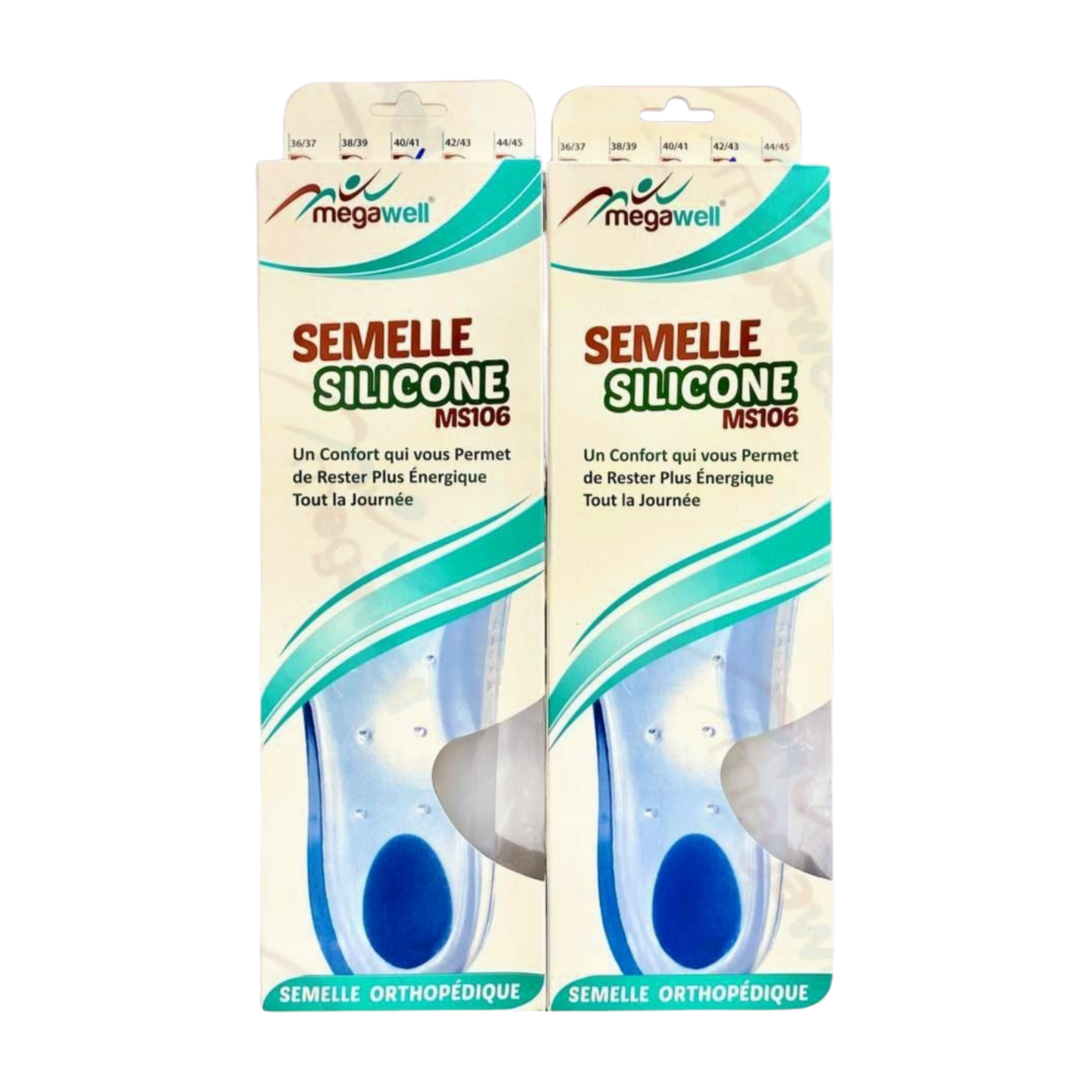 Mots clés : semelle silicone, semelle amortissante, confort pieds, soulager douleurs pieds, Megawell, Ms106, parapharmacie, dispositifs médicaux.
